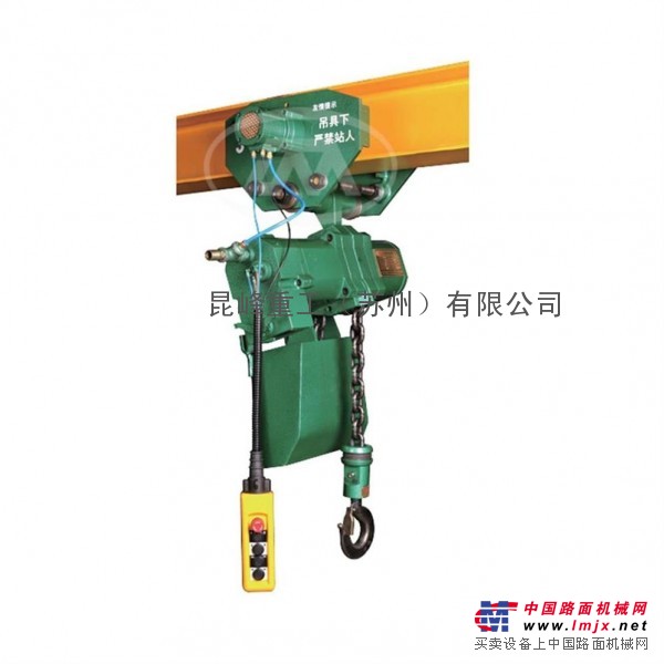 起吊机构包括气动马达、行星减速器、吊挂总成、制动器、起重链条、吊钩总成和主控阀。起吊机构通过控制主控阀,来实现起吊重物的升、降,通过开闭制动器达到起升、下降定位制动。环链气动葫芦确保起吊作业的安全,气动葫芦起吊机构整体可固定使用,也可置于行走机构下方移动使用。防爆电动葫芦